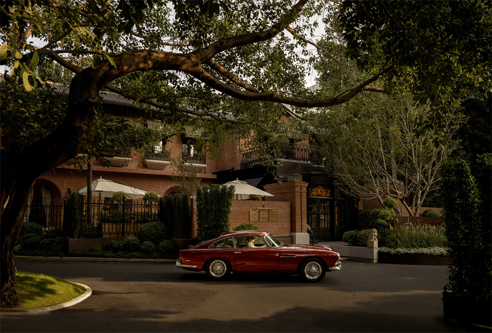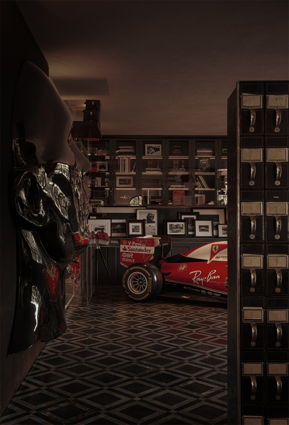 自进口拾步而入,雍熙荣一层即以展厅艺术铺陈空间叙事。古玩展陈、买手零售、咖啡休闲、花艺体会与交际空间互相浸透,不同分区在视觉与体会上彼此独立,又在全体美学语境中天然联合,编制了一场完好的沉溺式巡游。进口右侧的限时展区以深色木材与玻璃构筑的沉稳基调翻开文明气场,营建静寂抑制的“私家保藏厅”气氛,几许石材地上与博物馆式摆设让机械、速度与文明在此慢慢铺展。作为雍熙荣的首个品牌协作,本年11月,法拉利将Kimi Rikknen的Ferrari SF16-H(2016 Brazil Grand Prix 原车)及跃马新作Amalfi带入空间,注入明显的速度美学。展陈亦引入了经典老爷车保藏——梅赛德斯-奔驰190、路虎卫兵Series II、阿斯顿·马丁DB4等,以沉稳复古的绅士情怀刻画对话场景,演绎凝集品尝、激起谈资的文明剧场。